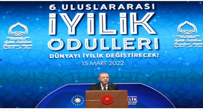 "Halka hizmet Hakk'a hizmettir" düsturuyla hareket eden Türkiye Diyanet Vakfı’nın, en prestijli faaliyetlerinden birisinin de Uluslararası İyilik Ödülleri olduğunu söyleyen Cumhurbaşkanı Erdoğan, sözlerini şöyle sürdürdü: "İyiliği yaymayı, iyiye ve iyiliğe olan farkındalığı artırmayı hedefleyen bu özel ödüllerin ülkemizde önemli bir ihtiyacı giderdiğini düşünüyorum. 'Dünyayı iyilik değiştirecek' şiarıyla çıktığımız iyilik seferberliği hamdolsun yoluna güçlenerek daha da serpilerek devam ediyor. Bu ödüller vesilesiyle yeryüzünün dört bir yanındaki iyi yürekler ve müşfik gönüller arasında her gün yeni köprüler kuruluyor. Mutmain bir kalp, gülen bir yüz, müteşekkir bir göz şöyle kalpten kopup gelen bir 'Allah razı olsun.' haricinde hiçbir karşılık beklemeden yapılan iyilikler geleceğe dair ümitlerimizi de yeşertiyor."