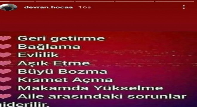Hocanın daha önce de sosyal medya üzerinden birçok kişiyi dolandırdığını öne süren G.E., “Eşimle aram çok kötü idi. Bir arkadaşımın tavsiyesi üzerine Devran Yıldırım isimli şahıs ile iletişime geçtim. Hiç param yoktu. Bana eşimde büyü olduğunu söyledi ve büyüyü bozmak için para istedi. Ben ilk olarak zaten cevşen yapması için ödeme yapmıştım. Büyüyü bozmak için param olmadığını söyledim. Daha sonra cevşenimi göndermesini istedim. 'Gerek yok' dedi. Ben de İslami usullere göre cevşeni kendim taşımam gerektiğini söyleyince beni her yerden engelledi. Çok pişmanım” dedi.