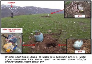 Sığınak etrafında tuzaklanan el yapımı bombanın yerinde imha edilmesi için güvenlik güçleri özel önlem aldı. Mutfak tüpüyle desteklenen el yapımı patlayıcı, seyyar sinyal kesici jammer kullanılarak uzaktan kumandalı fünye ile imha edildi.