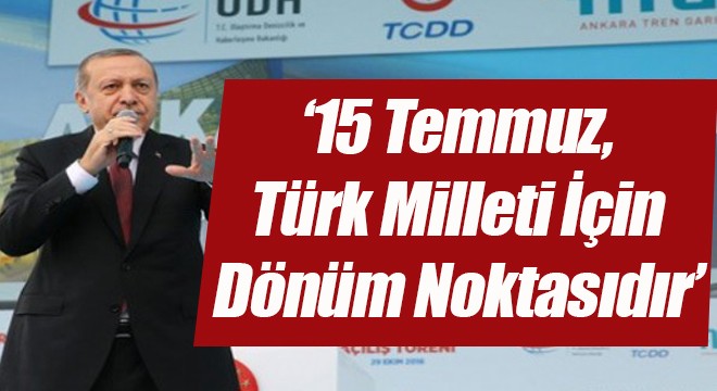 Ankara Yüksek Hızlı Tren Garı’nın açılış töreninde konuşan Cumhurbaşkanı Erdoğan, “Artık eski Türkiye yok. En son 15 Temmuz saldırısıyla gördük ki, ne yaparsak yapalım bize çelme takan, taş atan, yumruk vuran eksik olmayacak, her zaman bunlar olacak, bunu bileceğiz. Öyleyse bu mücadeleyi pısırık bir şekilde sağa-sola yalpalayarak değil, hedeflerimize kilitlenip yürüyerek vereceğiz. Kazanacaksak adam gibi kazanacağız, öleceksek adam gibi öleceğiz, artık bunun ortası kalmadı” dedi.
