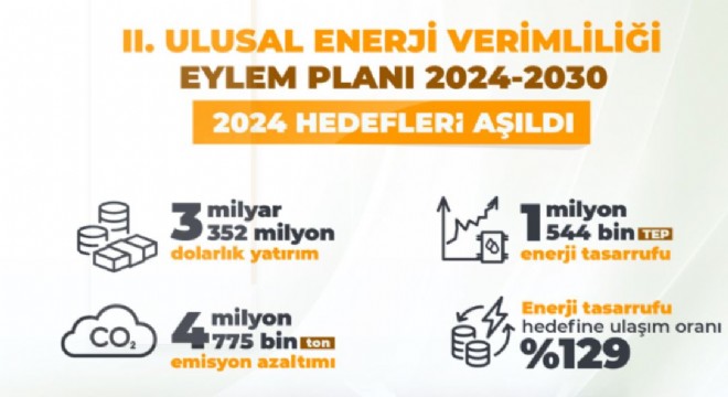 2024-2030 yıllarını kapsayan İkinci Enerji Verimliliği Eylem Planı, ilk yılında yüzleri güldürdü. Bakanlık tarafından yapılan 2024 yılı etki analizinde enerji verimliliğine toplam 3 milyar 352 milyon dolar yatırım yapıldığı, 1 milyon 544 bin TEP enerji tasarrufu ve 4 milyon 775 bin CO2 eşdeğer emisyon azaltımı elde edildiği belirlendi. Böylece eylem planında belirlenen hedef aşılarak yüzde 129’luk bir orana ulaşıldı.