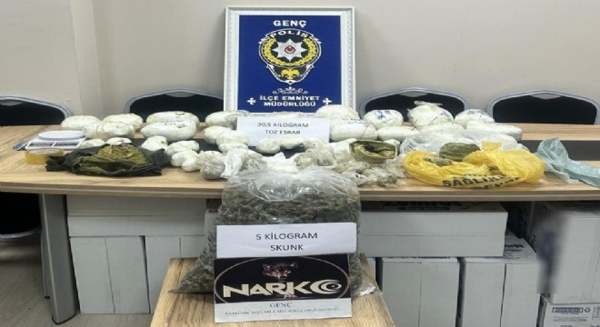Bingöl Valiliği tarafından yapılan açıklamada “Genç İlçe Emniyet Müdürlüğüne gelen bir ihbar sonucu Narkotik Suçlarla Mücadele Grup Amirliğine bağlı ekiplerce, uyuşturucu veya uyarıcı madde imal ve ticareti suçuna yönelik yapılan çalışmalar çerçevesinde operasyon düzenlendi. Operasyon sonucunda; 4 kilo 926 gram Skunk, 20 kilo 604 gram toz esrar maddesi ele geçirilmiştir. Konu ile ilgili olarak bir kişi yakalanmış olup, Genç İlçesi Narkotik Suçlarla Mücadele Grup Amirliği tarafından tahkikata başlanmıştır" denildi.