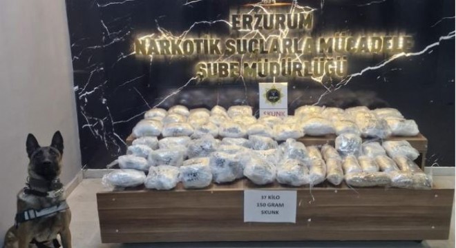 Erzurum polisi Narkotik Madde Arama Köpeği Hera ile yaptığı operasyonda 37 kilo 150 gram skunk maddesi ele geçirdi.