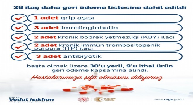 Çalışma ve Sosyal Güvenlik Bakanı Vedat Işıkhan, sosyal medya hesabından yaptığı açıklamada, ‘Bedeli Ödenecek İlaçlar Listesi’nde yeni düzenleme yapıldığını belirtti. Buna göre bir adet grip ilacı, 3 adet immünglobulin, 2 adet kronik böbrek yetmezliği (KBY) ilacı, iki adet konik immün trombositopenik purpura (ITP) ilacı ve 3 adet antibiyotik başta olmak üzere toplamda 39 ilaç geri ödeme listesine alındı.