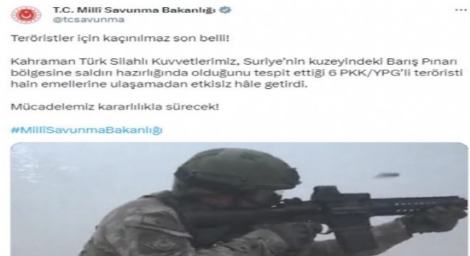 Milli Savunma Bakanlığı, sosyal medya hesabından yaptığı paylaşımda, terörle mücadelenin kararlılıkla sürdüğüne dikkati çekilerek, “Teröristler için kaçınılmaz son belli! Kahraman Türk Silahlı Kuvvetlerimiz, Suriye’nin kuzeyindeki Barış Pınarı bölgesine saldırı hazırlığında olduğunu tespit ettiği 6 PKK/YPG’li teröristi hain emellerine ulaşamadan etkisiz hale getirdi” ifadelerine yer verildi.