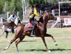 BİTLİS (İHA) - Bitlis’in Ahlat ilçesinde bu yıl 22’ncisi düzenlenen Ahlat-Avrasya Kültür Buluşması Şenlikleri kapsamında düzenlenen cirit yarışmaları büyük bir heyecanla izlenirken, Ahlat Belediye Başkanı ise atın üzerinde basın açıklaması yaptı.
