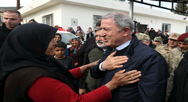 Milli Savunma Bakanı Hulusi Akar, depremin vurduğu Kırıkhan ilçe merkezi ve köylerinde bir araya geldiği depremzedelere "Hiçbir zaman yalnız değilsiniz. Biz kederde ve kıvançta bir ve beraberiz. 85 milyon tek yumruk, tek yürek" dedi.