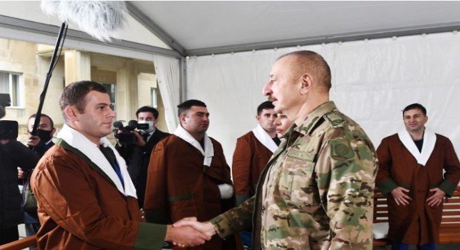 Azerbaycan Cumhurbaşkanı İlham Aliyev, tedavi altına alınan askerlerle görüşmesinde, "Hem savaş alanında hem de müzakere masasında istediğimizi aldık. Bu zaferin kazanılmasında Türkiye'nin siyasi ve manevi desteği büyük rol oynadı" dedi.