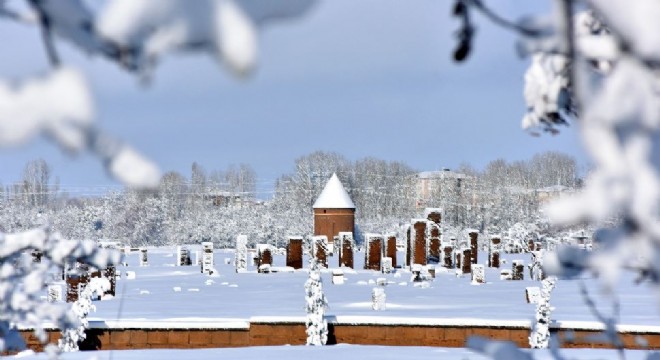 Bitlis’in Ahlat ilçesindeki tarihi yapıların karla bütünleşmesi, seyrine doyumsuz manzaralar oluşturuyor.