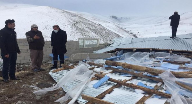 Aşkale ilçesinde gece saatlerinde etkili olan şiddetli rüzgar bir ahırın çatısını uçurdu.