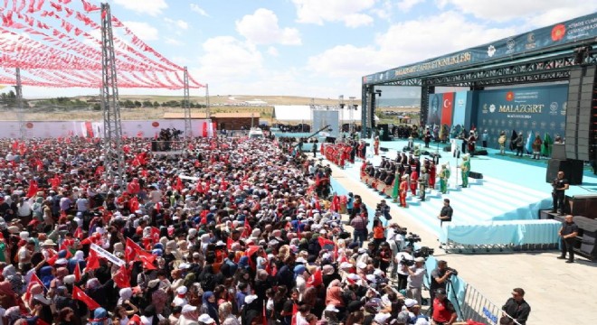 Cumhurbaşkanı Erdoğan, "Bir cuma sabahı, semaya karşı, Malazgirt'te 54 bin er, bestelediler en güzel marşı: Allahu ekber, Allahu ekber" dizelerine atıfta bulunarak, "Bu mısralara ilham veren o günkü imanla, o günkü cesaretle, o günkü adanmışlıkla bugün yine Malazgirt'teyiz" dedi.