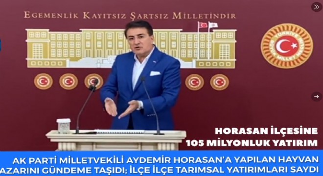 Milletvekili Aydemir TBMM’deki basın toplantısında, Horasan ilçesindeki Canlı Hayvan Pazarı açılışını gündeme taşıdı, Erzurum odaklı tarımsal yatırımlara işaret etti. Büyükşehir Belediyesinin ilçe ilçe yaptıklarına ve hususen Horasan’a 100 Milyonu aşan hayvancılık yatırımlarına teşekkür eden Milletvekili Aydemir, Erzurum Büyükşehir Belediyesinin halka hizmette tarih yazdığını, CHP’li İstanbul Belediye Başkanının ise halkın beklentilerini duymazdan gelerek Diyarbakır’da gezdiğini hatırlattı.