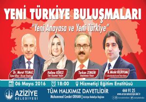“Yeni Anayasa ve Yeni Türkiye” konulu ‘Yeni Türkiye Buluşmaları’ paneli 06 Mayıs Cuma günü saat: 18:00’de Erzurum’da yapılacak. Ilıca yolu üzerindeki Hizmetiçi Eğitim Enstitüsü Konferans Salonu’nda gerçekleşecek panelin oturum yöneticiliğini Siyaset Bilimci Dr. Murat Yılmaz yapacak. Panele, Türkiye Cumhuriyeti Cumhurbaşkanlığı Kurumsal iletişim Başkanı M. Mücahit Küçükyılmaz, Star Gazetesi Yazarı Halime Kökçe ve Araştırmacı-Yazar Tarkan Zengin konuşmacı olarak katılacak.