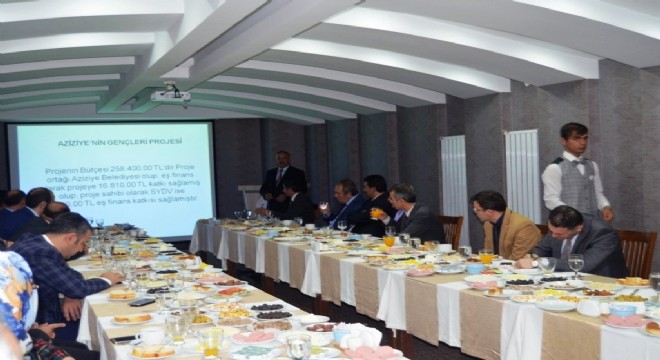 Aziziye Kaymakamlığı Proje Ofisi Koordinatörü Orhan Tınğ ve Proje uzmanı Uğur Hasdemir, Aziziye Kaymakamlığı Proje Ofisinin tanıtımı, devam eden projeler, tamamlanan projeler ve SODES projesi kapsamında ilçeye kazandırılan Gençlik Merkezinin çalışmaları ile ilgili sunum yaptı.
