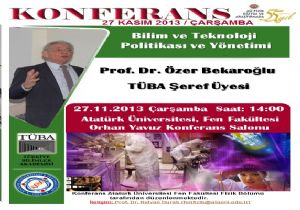 TÜBA Şeref üyesi Prof. Dr. Özer Bekaroğlu, Atatürk üniversitesi Fen Fakültesi Fizik Bölümü tarafından düzenlenen konferansta Bilim ve Teknoloji Politikaları ve Yönetimi’ni anlatacak. 27 Kasım Çarşamba günü Fen Fakültesi Konferans salonunda gerçekleştirilecek etkinlikle ilgili bir değerlendirme sunumu yapan Bekaroğlu Bilim ve Teknoloji yönetimine dikkat çekerek, “ B&T Politikası ve yönetimi konusu 16. yüzyılda BİLİM RÖNESANSI ve 17. yüzyıl sonunda ENDÜSTRİ DEVRİMİ  ile başlamış ve bir bilim dalı olarak yüzlerce makale ve onlarca kitap yayımlanmış,  yayımlanmakta ve ülkeler için vazgeçilmez önemi tartışılmaktadır.  ABD’de 1959 dan bu yana çok ciddi olarak üzerinde durulan bu konunun Türkiye’de önemi henüz anlaşılamamış ve ciddi olarak çalışılmamaktadır.  Çeşitli fikir ve karşıt fikirler ileri sürülen bu konuda bilim adamları ve uzmanların birleştikleri bazı noktaları başlıklar halinde belirtilmeye çalışılarak çok karışık olan bu konuya tarihi bir örnek verilerek bir ülkenin nasıl ilerlediği anlatılacak ve Türkiye’deki durum açıklanacaktır.” dedi.