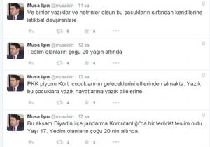 Ağrı Valisi Musa Işın, sosyal medya hesabından yaptığı açıklamada, bir teröristtin Diyadin İlçe Jandarma Komutanlığı’na teslim olduğunu ifade etti. Sosyal medya hesabı Twitter üzerinden açıklamalarda bulunan Vali Musa Işın, "Bu akşam Diyadin İlçe Jandarma Komutanlığı'na bir terörist teslim oldu. Yaşı 17. Teslim olanların çoğu 20'nin altında. PKK piyonu Kürt çocuklarının geleceklerini ellerinden almakta. Yazık bu çocuklara yazık, hayatlara yazık, ailelerine teslim olanların çoğu 20 yaşın altında ve binlerce yazıklar olsun bu çocukların sırtından kendilerine istikbal devşirenlere" dedi.