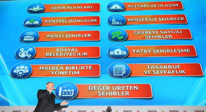 AK Parti’nin belediyecilikte çığır açmış, milletin gönlünde hizmetleriyle yer edinmiş kadrolar tarafından kurulmuş bir parti olduğunun altını çizen Erdoğan, “AK Parti kadrolarının belediyelerdeki başarılarının gerisinde, halka hizmeti Hakk'a hizmet bilen bir paradigma değişikliği vardır. Bu yaklaşımla emaneti korumayı ve ehline teslim etmeyi esas alan, hizmeti memur- işçi mesai süresiyle sınırlamayıp 24 saate, 7 güne yayan, vatandaşın her derdine derman olmak için çırpınan bir yönetim pratiği sergilenmiştir. Öyle ki bu kadro belediye çalışanlarının yetişemediği temizlik gibi kimi hizmetlerin aksaksız yürümesini, parti teşkilatlarından gönüllüler vasıtasıyla gerçekleştirecek kadar kendini işine adamıştır. Belediyecilikteki tecrübemizi ve birikimimizi sürekli zenginleştirerek, geliştirerek, büyüterek tüm Türkiye’nin hizmetine sunduk. Milletimizin karşısına 1994 mahalli idareler seçimlerinde bu ülkenin CHP’den tevarüs ettiği çöp, çukur ve çamurla mücadele diyerek çıktık. Onlardan tamamen arındırdık. 2004’te ‘yerel kalkınma başlıyor’ sloganını kullandık, o günden bugüne belediye başkanlarımızın önüne çok büyük hedefler koyduk. İstanbul temizlendiyse, Ümraniye’deki çöp depolama alanı patlamak suretiyle 39 vatandaşımız öldüyse herhalde bunun hesabının sorulması gerekir. İlçede de belediye CHP, büyükşehirde de. Ankara’da da böyleydi. Aldıktan sonra buralar değişti. Teslim alınmayan yerlerde susuzluk devam ediyor, işte İzmir. Altyapı, yol-kaldırım, su, çöp, temiz çevre, temiz hava gibi temel hizmet alanlarındaki sorunları çözmeden şehirlerimizi kalkındıramayız dedik. Hamdolsun kısa sürede bu sıkıntıların üstesinden geldik ve şehirlerimizi çok ileri hizmet standartlarına kavuşturduk. Ardından 2009 mahalli idareler seçimlerinde ‘işimiz hizmet gücümüz millet’ diyerek marka şehirler hedefledik. Her şehrimizin, bölgesinin, ülkemizin ve dünyanın önemli bir markası haline gelebilmesi hedefiyle milletimizin karşısına çıktık. Altyapıdan çevre sorunlarına kadar her alanda, daha ayrıntılı, daha ince işçiliğe yönelik yatırımları hayata geçirdik. Potansiyeli olan her ilimizin dünya çapında marka şehir haline dönüşme çabasına destek verdik. Türkiye’nin gündemi değiştikçe, mahalli idarelerdeki hedeflerimizi de ileriye taşıdık ve 2014 seçimlerinde ‘daima millet, daima hizmet’ dedik. Böylece her türlü vesayet, darbe ve saldırıya karşı, milletimizin emrinde bir şekilde hizmet yürüyüşümüzü sürdürme kararlılığımızı ifade ettik. Ülkemizin istiklaline ve istikbaline göz dikenlere karşı, 15 Temmuz’da olduğu gibi milletimizle birlikte mücadele ederken, hizmet yarışında da yine en önde olduk. Şimdi de, ‘tevazu samimiyet ve gayret ile memleket işi gönül işi’ diyerek, ‘gönül belediyeciliği’ sözüyle milletimizin huzuruna çıkıyoruz. Halkımıza, yeni bir heyecanla, yeni bir vizyonla, kimi tecrübeli, kimi yeni ama birikimli ve vizyoner isimlerle şehirlerimizi daha ileriye taşımanın sözünü veriyoruz. Hedefimiz istisnasız tüm fertleriyle önce milletimizin gönlünü kazanmak, ardından sandıkta oyunu almaktır. Her seçimin bir imtihan olduğunu biliyoruz. 31 Mart 2019 imtihanından başarıyla çıkmak için, geçmişte yaptığımız hizmetlerle yetinmiyoruz. Bu büyük müktesebatın yanında, şehirlerimizi geleceğe hazırlayacak yeni projeler geliştiriyoruz. Önümüzdeki dönemde, tıpkı ülkemizin diğer vizyoner projeleri gibi şehirlerimiz için de kısa, orta ve uzun vadeli strateji belgeleri hazırlayacağız. Bakanlıklarımızdan en küçük belediye birimlerimize kadar, şehirlerimizle ilgili tüm planları, projeleri, yatırımları, hizmetleri bu strateji belgeleri üzerinden takip edeceğiz. Kısa vadeli hedefleri her yıl, orta vadeli hedefleri belediye başkanlarımızın dönemlerinin bitiminde, uzun vadeli hedefleri de ülkemizin 2023, 2053, 2071 vizyonlarıyla bağlantılı şekilde değerlendireceğiz” dedi.