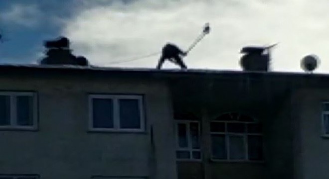 Erzurum’da bellerine bağladıkları iple yüksek binaların çatılarındaki karları temizleyen kişiler ölüme meydan okuyor.