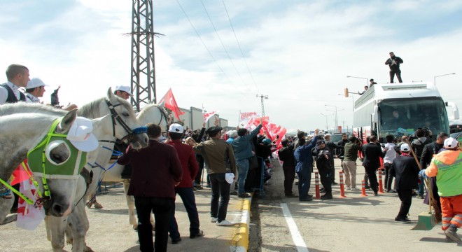 Erzurum Havalimanına gelen Cumhurbaşkanı Erdoğan, Cumhurbaşkanlığı otobüsüyle miting alanına geçerken yolu cirit ekipleri tarafından kesildi. 35 kişilik atlı cirit ekibi ve yüzlerce vatandaş, Cumhurbaşkanı Erdoğan’a sevgi gösterisinde bulundu. Bu sırada yoğun izdiham yaşandı. Kalabalık arasında bir cirit atı ise devrildi.