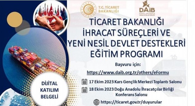 Ticaret Bakanlığı koordinatörlüğünde, Doğu Anadolu İhracatçılar Birliği organizasyonda, Kars ve Erzurum illerinde ihracatın tabana yayılması, bölge ülkeleri ile yapılan ticaretin ve ihracatın artmasına katkı sağlamak amacıyla 17 ve 18 Ekimde eğitim çalışması gerçekleştirilecek. Eğitim çalışmasının Erzurum etabı 18 Ekim 2023’de kaydedilecek.