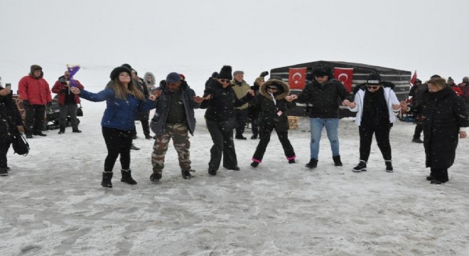 Kars’ta vatandaşlar, yüzeyi tamamen buz tutan Çıldır Gölü’nde Kafkas dansı yapıp halay çekerek gönüllerince oynadı.