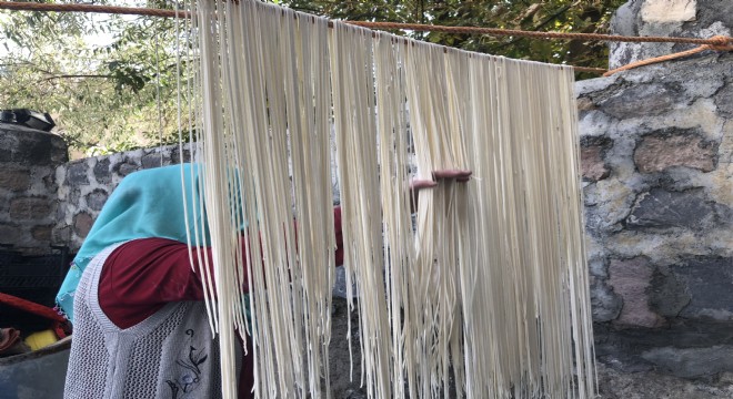 Kars’ta kış sofralarının vazgeçilmez yemeklerinden olan ‘erişte’ kesilerek iplerde yerini almaya başladı.