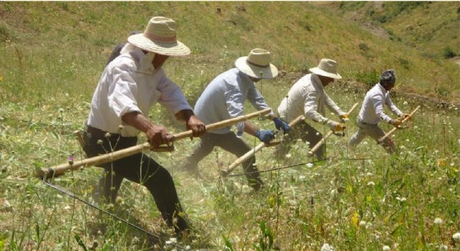 İlçeye bağlı Tarlacık köyünde bir araya gelen tırpancılar, sabah erken saatlerde 2 bin 200 rakımlı yamaçlara çıkarak akşam saatine kadar tırpan çekiyor. İmece usulü ot biçimi yapan köylüler, zorlu koşullara rağmen işlerini türküler eşliğinde yaparak günü bitiriyor. Bir araya gelen onlarca çiftçi, elbirliğiyle tırpan çekerek günde ortalama bin 200 bağ ot biçiyor.