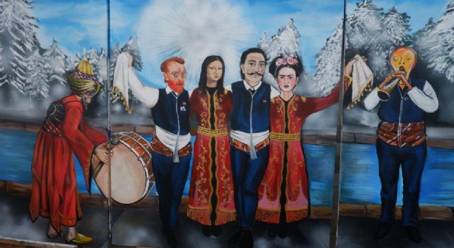 Erzurum’da bir öğretmen ve iki öğrencisi dünyaca ünlü isimleri Erzurum halk oyunu barda buluşturdu, yağlı boya tablosunda bir araya getirdi.