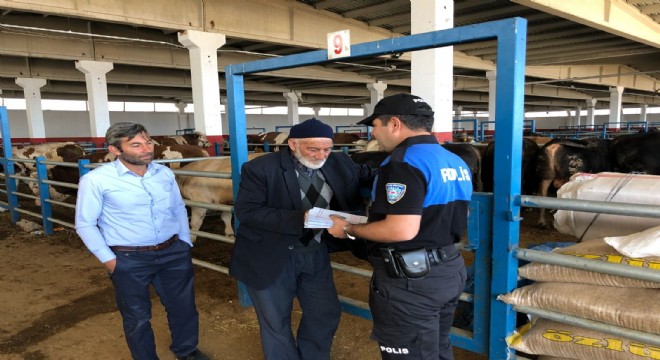 Erzurum Hayvan Pazarında, Asayiş Daire Başkanlığı ekipleri vatandaşları ve kurban satıcılarını sahte para ve dolandırıcılık konusunda uyardı.