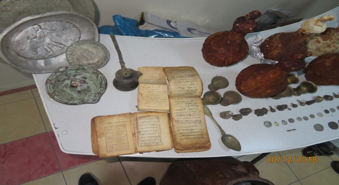Erzincan İl Emniyet Müdürlüğüne bağlı Kaçakçılık ve Organize Suçlarla Mücadele Şube Müdürlüğünce yürütülen soruşturma kapsamında Türkiye genelinde Kültür ve Tabiat Varlıklarını Koruma kanuna muhalefet suçu işledikleri değerlendirilen şahıslara yönelik 18.12.2018 tarihinde Erzincan merkezli 11 ildeki 34 adreste gerçekleştirilen eş zamanlı operasyondaki aramalarda 9 adet şarap testisi, 37 adet sikke, 45 adet obje, 4 adet el yazması kitap, 3 adet el ile çizilmiş harita, bir adet tarihi eser olduğu değerlendirilen bir metre boyunda boş küp, bir adet dedektör ve 12 adet define aramada kullanılan metal çubuk ele geçirildi.