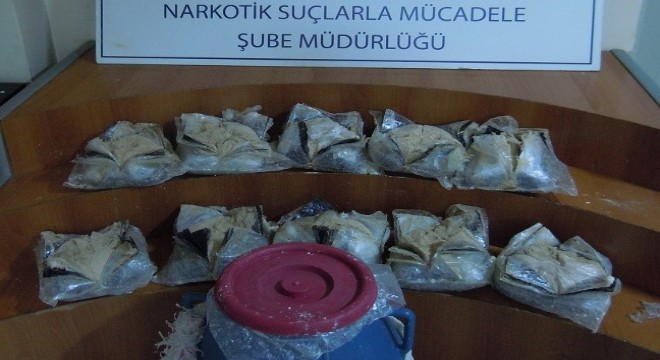 Edinilen bilgiye göre, Aşkale uygulama noktasında şüphe üzerine durdurulan bir seyahat firmasına ait yolcu otobüsünde arama yapıldı. Bagaj kontrolleri sırasında F.M. isimli şansında bagajında yapılan aramada peynir bidonu içerisinde peynirlerin altına zulalanmış 10 paket şeklinde 10 Kilo 730 gram eroin maddesi ele geçirildi.