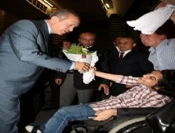 Tekerlekli sandalyede bulunan Büşra Aydar’ın üniversiteyi ayakta okumak istediğini söyleyen Başbakan Erdoğan, “Bak üniversiteyi ayakta okumak istiyor. İşte hayat dolu, azmi var kararlılığı var bakın üniversiteye geldi dayandı. Biz de elimizden gelen desteği vereceğiz. Şimdi bana diyor ki, nasıl dimdik ayakta duruyorsun diyor. Sizin dualarınızla” şeklinde konuştu.