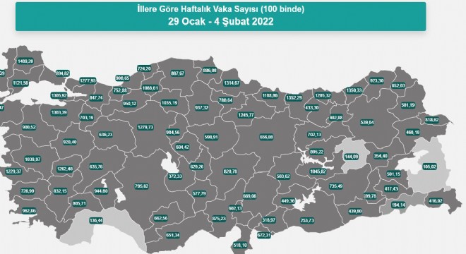Sağlık Bakanı Fahrettin Koca, sosyal medya hesabı üzerinden 29 Ocak-4 Şubat tarihleri arasındaki il bazında 100 bin kişi içindeki bir haftalık toplam yeni Covid-19 vaka sayısını paylaştı. Paylaşıma göre son bir haftada il bazında her 100 bin kişide vaka sayısı Ankara’da bin 279,73, İzmir'de bin 229,37, İstanbul’da 894,82 oldu.