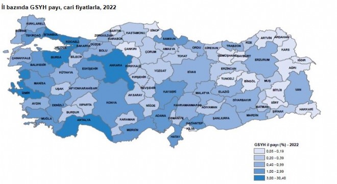 İl düzeyinde cari fiyatlarla GSYH hesaplamalarına göre; 2022 yılında İstanbul 4 trilyon 564 milyar 280 milyon TL ile en yüksek GSYH'ye ulaştı ve toplam GSYH'den yüzde 30,4 pay aldı. İstanbul'u, 1 trilyon 329 milyar 810 milyon TL ve yüzde 8,9 pay ile Ankara, 972 milyar 238 milyon TL ve yüzde 6,5 pay ile İzmir izledi. Ayrıca on üç sırada 11 milyar 288 milyon TL ile Tunceli, 10 milyar 539 milyon TL ile Ardahan ve 8 milyar 287 milyon TL ile Bayburt yer aldı.
