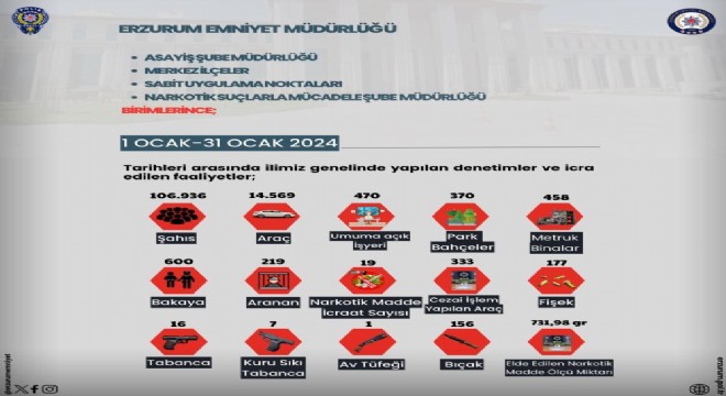Erzurum Emniyet Müdürlüğü; merkez ilçeler, sabit uygulama noktaları, Asayiş Şube Müdürlüğü ve Narkotik Suçlarla Mücadele Şube Müdürlüğü’ne bağlı birimlerin 1 Ocak-31 Ocak 2024 tarihleri arasında Erzurum genelinde yaptığı denetim ve icra edilen faaliyetler hakkında açıklama yaptı.