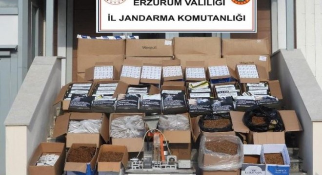 Erzurum İl Jandarma Komutanlığı ve İl Emniyet Müdürlüğü tarafından 23 Eylül 2024 günü Yakutiye ilçe merkezinde 3 şahsa ait imalathanede yapılan müşterek aramada; 5 bin 750 paket kaçak sigara, 428 bin 541 adet boş makaron, 222 bin 547 adet içi tütünle doldurulmuş makaron, bin 453 kg. kaçak tütün, 55 bin 159 adet sigara sarma kağıdı, 55 bin 340 adet sigara filtresi, 652 adet kesilerek toplanmış bandrol ve 1 adet sigara dolum makinesi ele geçirildi.
