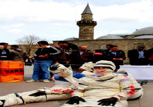 ERZURUM (İHA) - Erzurum Rabia Platformu ve Atatürk Üniversitesi Güzel Sanatlar Fakültesi öğrencileri, Mısır ve Suriye’de kimyasal gazlarla Müslümanların öldürülmesine tepki olarak tiyatrolu protesto yaptı.