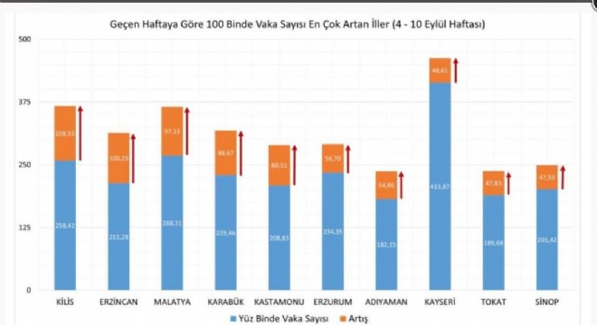 Sağlık Bakanı Koca: "4-10 Eylül arasında vaka yoğunluğu bir önceki haftaya göre en çok artan 10 ilimiz: Kilis, Erzincan, Malatya, Karabük, Kastamonu, Erzurum, Adıyaman, Kayseri, Tokat, Sinop! Bu illerden birindeyseniz şimdi daha da dikkatli olmalısınız." uyarısını yaptı.
