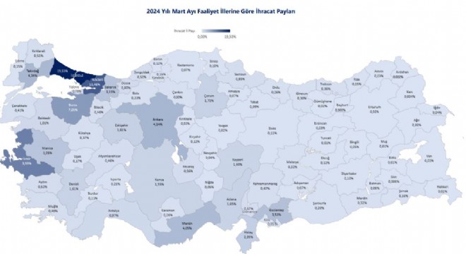 Firmaların merkezini baz alan TİM verilerine göre 81 ilimizden 43'ü ihracatını artırmayı başardı. En fazla ihracat yapan beş ilimiz İstanbul, Kocaeli, Bursa, İzmir ve Ankara oldu. Balıkesir, Edirne, Erzincan ve Kocaeli tarihlerinin en yüksek ihracat değerine ulaştı. Karadeniz, Doğu Anadolu, Akdeniz ve İç Anadolu bölgelerimiz ihracatlarını artırdı. Birim ihracat değerini en çok artıran illerimiz Yalova, Nevşehir ve Isparta, sektörlerimiz ise zeytin ve zeytinyağı, fındık ve kuru meyve oldu. 1.421 firmamız ilk kez ihracat gerçekleştirdi. En çok ihracat yaptığımız ülkeler Almanya, İtalya, ABD, Irak ve Birleşik Krallık şeklinde sıralandı. Özellikle Latin Amerika'ya ihracatta ciddi artış kaydettik. Euro/dolar paritesinin ihracatımıza pozitif etkisi devam ediyor. Geçen ay parite farkı ihracatımıza 161 milyon dolar katkı verdi. Birim ihracat değerimiz ise 1,41 dolar oldu. Ayrıca Hizmet İhracatçıları Birliğimizin çalışmasına göre mart ayında yaklaşık 7,7 milyar dolarlık hizmet ihracatı gerçekleştirdiğimizi tahmin ediyoruz.”
