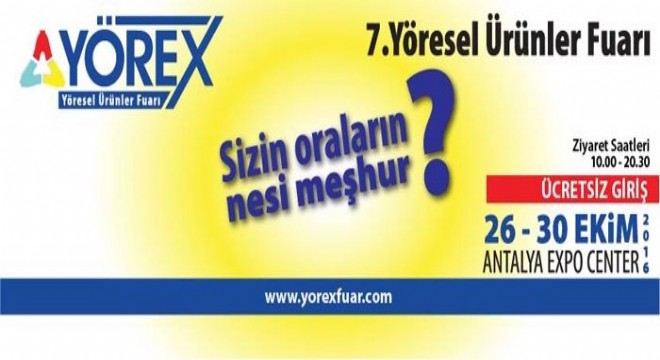 Antalya Ticaret Borsası Yönetim Kurulu Başkanı Ali Çandır, YÖREX’in 26 Ekim Çarşamba günü saat 11.00’de ANFAŞ Antalya Fuar Merkezi’nde kapılarını açacağını, 70 ilden binlerce yöresel ürüne ev sahipliği yapacağını bildirdi. Çandır, “Sizin oraların nesi meşhur” sloganıyla 5 gün sürecek YÖREX’te Aydın incirinden, Çanakkale Mevlevi tatlısına, Erzurum oltu taşından, Van kedisine, Zonguldak elpek bezinden, Finike portakalına, Devrek bastonundan Hereke halısına, Diyarbakır örgü peynirinden Kars kaşarına binlerce ürünün ziyaretçilerin damak tadına ve göz zevkine sunulacağını vurguladı. Çandır, “10 bin metrekarede Türkiye’nin kuzeyini güneyini, doğusu batısını bir araya getireceğiz” dedi.