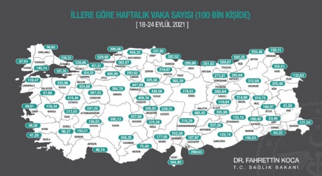 18 – 24 Eylül aralığında iller her yüz binde görülen vaka sayısı yüksekliği kaydında şöyle sıralandı: