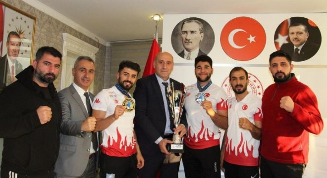 Şampiyon kick boksçular Cebrail Gençoğlu, Hakan Koç ve aynı zamanda sporcu unvanı ile de tatamiye çıkan antrenör Emre Şahin, kendilerine yakın bir ilgi gösteren Gençlik ve Spor İl Müdürü Birdal Öztürk’e teşekkür etti.