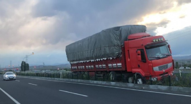 Kars – Erzurum yolunda sürücünün direksiyon hakimiyetini kaybettiği tır, orta refüje çıktı. Kazada yaralanan olmazken, tır maddi hasar gördü.
