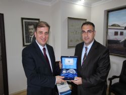 Başkan Cengiz, Bölge İdare Mahkemesi Başkanı Güler’e ziyaret anısına belediye armalı fincan takımı hediye etti.