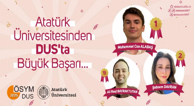 DUS 2025 sonuçlarına göre Atatürk Üniversitesi Diş Hekimliği Fakültesinden Muhammet Can Alabaş 75,156 puanla Türkiye 1’incisi, Şebnem Davran 74,000 puanla Türkiye 2’ncisi, Ali Rauf Bayraktutan ise 72,387 puanla Türkiye 9’uncusu oldu. Üç öğrencinin de ülke çapındaki sıralamada ilk 10’da yer alması, fakültenin akademik başarısını bir kez daha gözler önüne serdi.