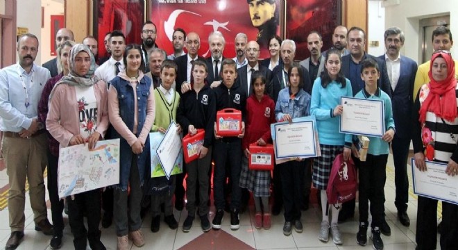 Yarışmada birinci olan öğrenciye laptop, ikinciye tablet, üçüncüye çeyrek altın ve diğer dereceye girenlere çanta, boyama seti hediye edildi.