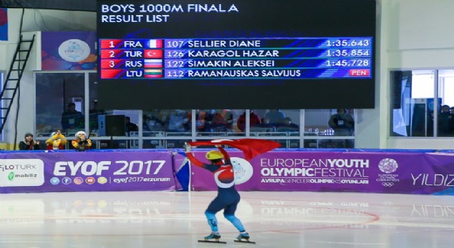 Avrupa Gençlik Olimpik Kış Festivali’nde erkekler sürat pateni 1000 metre finalinde Türk sporcu Hazar Karagöl tarihi bir başarı elde ederek gümüş madalya kazandı.