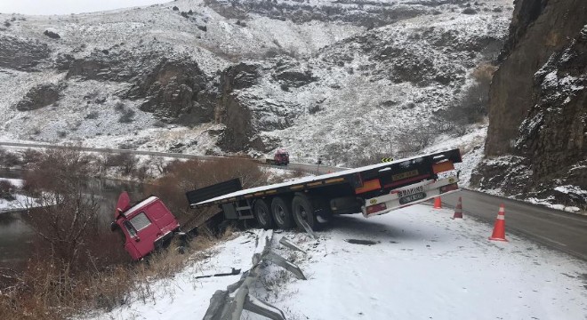 Erzincan'ın Refahiye ilçesinde, kar nedeniyle kayganlaşan yolda sürücüsünün ...