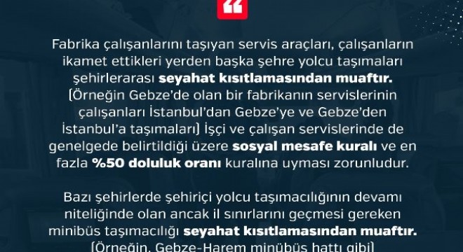 Genelgeye göre, fabrika çalışanlarını taşıyan servis araçları, çalışanların ikamet ettikleri yerden başka şehre yolcu taşımaları, şehirlerarası seyahat kısıtlamasından muaf tutulacak. İşçi ve çalışan servislerinde de ilgili genelgede belirtildiği üzere, sosyal mesafe kuralı ve en fazla yüzde 50 doluluk oranı kuralına uyulması zorunlu olacak. Bazı şehirlerde şehir içi yolcu taşımacılığının devamı niteliğinde olan ancak il sınırlarını geçmesi gereken minibüs taşımacılığı da seyahat kısıtlamasına tabi olmayacak. Sosyal mesafe ve yüzde 50 doluluk oranı kuralı burada da zorunlu tutulacak.