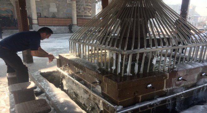Erzurum’da Lala Paşa Cami'inde öğle namazını kılmaya gelen vatandaşlar ise buz tutan şadırvanda abdest aldılar.